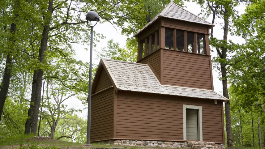 Atokiau nuo parko stovi Vergų bokštas. Unikalus statinys, kažkada greičiausiai skirtas baudžiauninkams kalinti arba produktams šaldyti, ežero pakrantėje iškilo XVIII amžiuje. 75 centimetro storio sienų statinys – Folkerzambų ir Valujevų žiauraus elgesio su baudžiauninkais liudininkas.